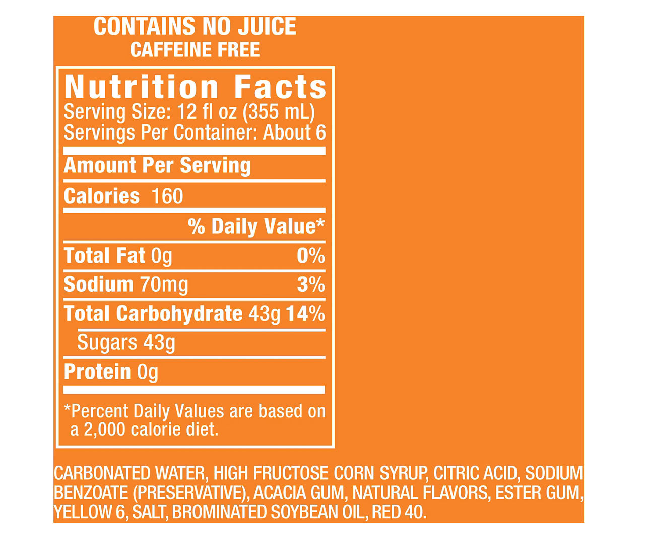 Orange Crush Nutrition Facts - Eat This Much Calories, carbs, fat, protein, fiber, cholesterol, and more for Orange Crush ( Juan Pollo). Want to use it in a meal plan? Head to the diet generator and enter the number of calories you want. Crush Orange Soda - 12/12 oz. Nutrition Facts & Calories - Inlivo NUTRITION LABEL (% of daily value based on 2000 calories per day) Nutrition Facts. Crush Orange Soda - 12/12 oz. Serving Size: serving (100g) * Amount Per Serving ; Calories: 43 cal : Calories from Fat: 0 cal % Daily Value : Total Fat: 0 g : 0%: Saturated Fat : 0 g : 🔒% Cholesterol: 0 mg : Crush Soda, Diet, Orange: calories, nutrition analysis & more ... Personalized health review for Crush Soda, Diet, Orange: 20 calories, nutrition grade (D plus), problematic ingredients, and more. ... But you won't see this warning label any time soon - manufacturers simply reduced the use of caramel color enough that the labeling requirements no longer applied. ... Orange: 20 calories, nutrition grade (D ... Orange, Grape, Strawberry & More | Crush Soda Crush Soda. Crush offers an exciting rush of flavor and fun in every sip. As the original orange soda, Crush has a long history of delighting consumers with a wide range of crowd-pleasing fruity flavors. Available in Orange, Grape, Strawberry, Pineapple, Watermelon, Peach, Grapefruit and Zero Sugar Orange, Crush has enough variety for the whole ...