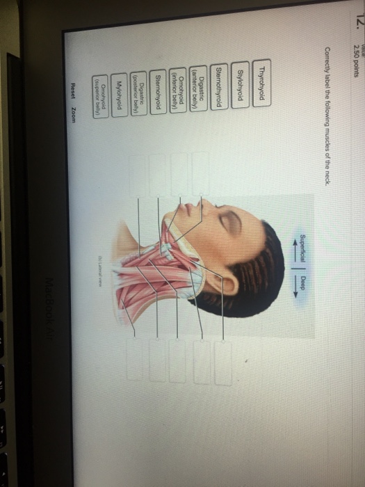 Solved Correctly label the following muscles of the neck. - Chegg Anatomy and Physiology. Anatomy and Physiology questions and answers. Correctly label the following muscles of the neck. Stylohyoid Omohyoid (superior belly) Sternohyoid Mylohyoid Thyrohyoid (inferior (anterior belly) posterior Sternothyroid Reset Zoom くPrev 31of 50Hİ Next: Question: Correctly label the following muscles of the neck.