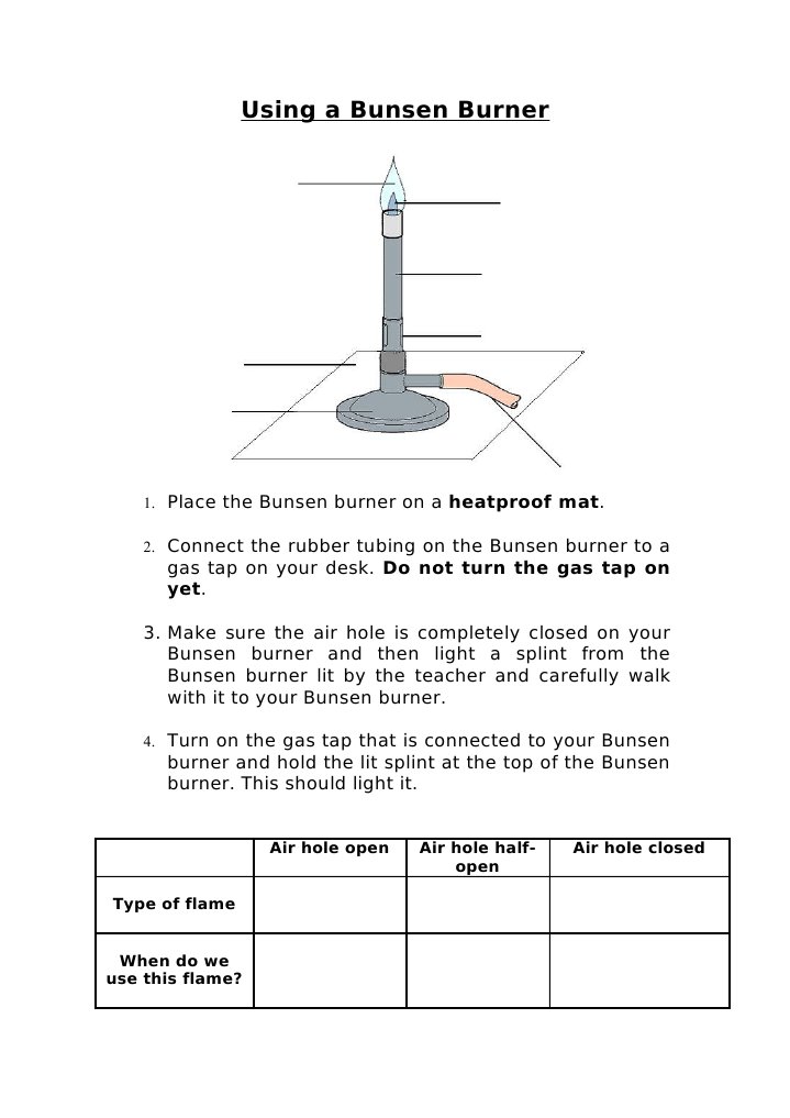 How To Use A Bunsen Burner Worksheet ? - thesource2.metro 3. Place a bunsen burner or spirit lamp underneath the tripod stand. 4. Light the bunsen burner/spirit lamp and gently heat the candle wax. 5. Observe the change in state as the candle wax heats up. Do not overheat the candle wax. 6. Turn off the bunsen burner…