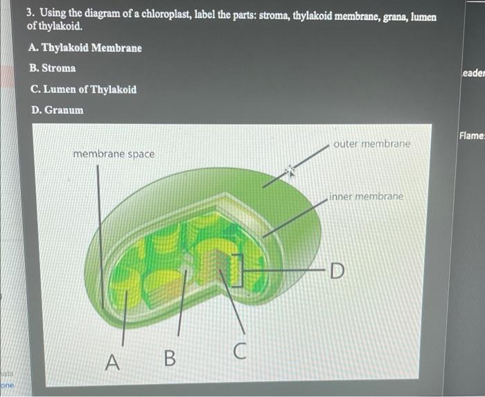 Labeling Parts to a Chloroplast Diagram - Quizlet Labeling Parts to a Chloroplast Diagram | Quizlet Labeling Parts to a Chloroplast + − Flashcards Learn Test Match Created by Abby_Larson72 Terms in this set (5) outer membrane ... inner membrane ... stoma ... granum stack of thylakoids thylakoid ... Sets with similar terms CCM - Delta Science 18 terms sulzen Biology- Parts of the flower 12 terms