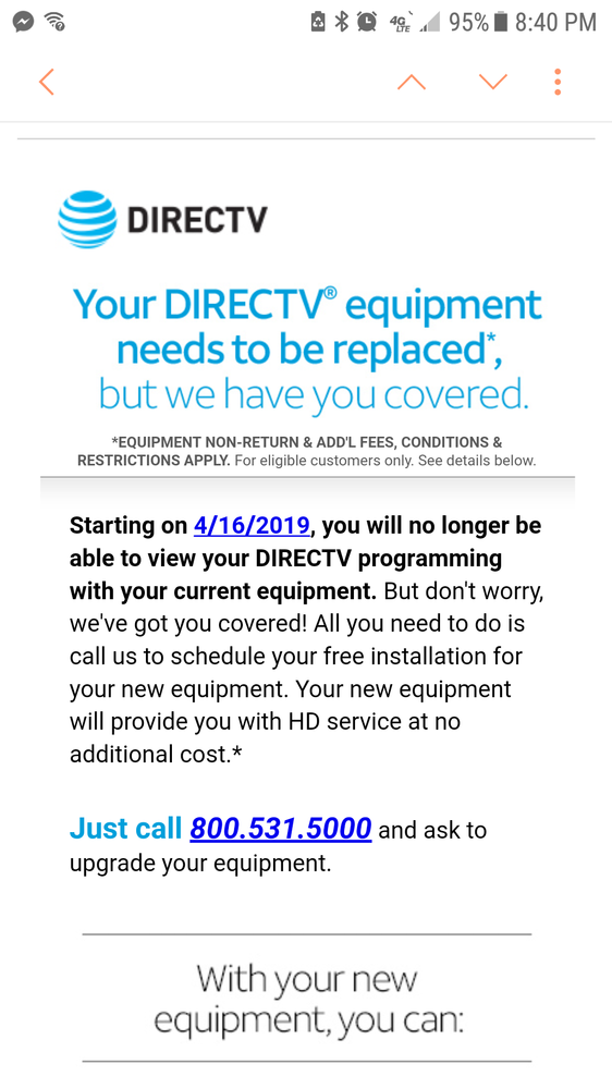 Learn How To Return DirecTV Equipment Effortlessly [Top Tips] - DoNotPay After changing or canceling the service, DirecTV should have sent you a letter or an email letting you know which pieces of equipment you should send back. If you have not received it, call customer service at 800-531-5000. Based on what they tell you, follow one of the return procedures below. Return DirecTV Equipment With FedEx or UPS