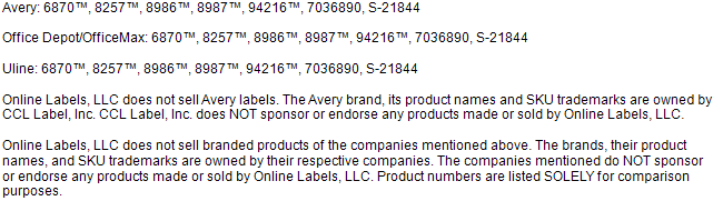 Brand-Name Label Cross-Reference List | OnlineLabels® At OnlineLabels, you can mix and match any product to get the combination you're looking for. Choose from several similar products before narrowing down your pick. Our standard label configurations come in more than 40+ materials and you can select any quantity thanks to our no minimum orders promise. You're paying their markup. Label Templates - ULINE Avery ® cross-reference numbers are used here solely for selection of proper software template layout in most popular label software programs.